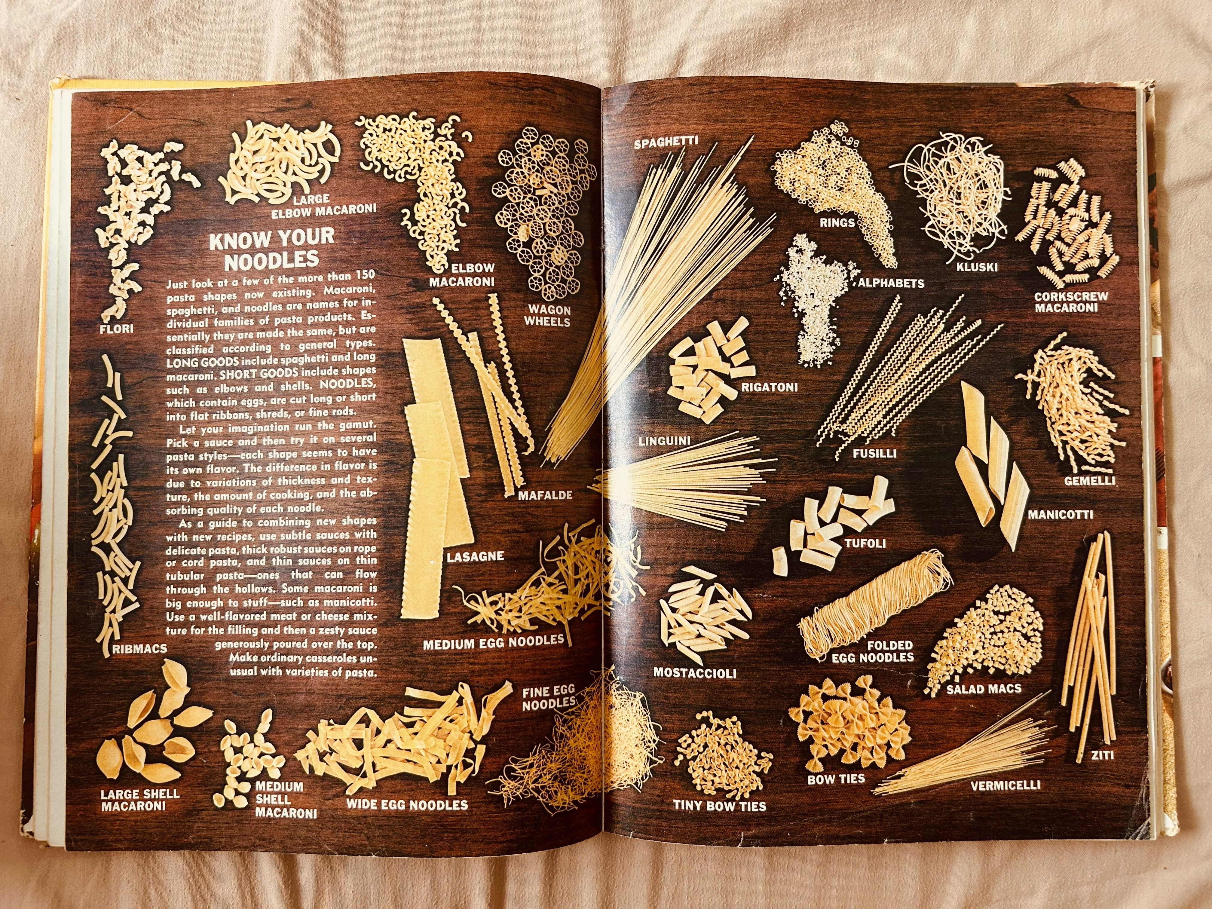 While most of the cookbook contains grayscale images of assorted casserole dishes, it has colored pages for certain recipes like cheese soufflé and curried lamb. There is even a two-page section that is focused on different pasta types!